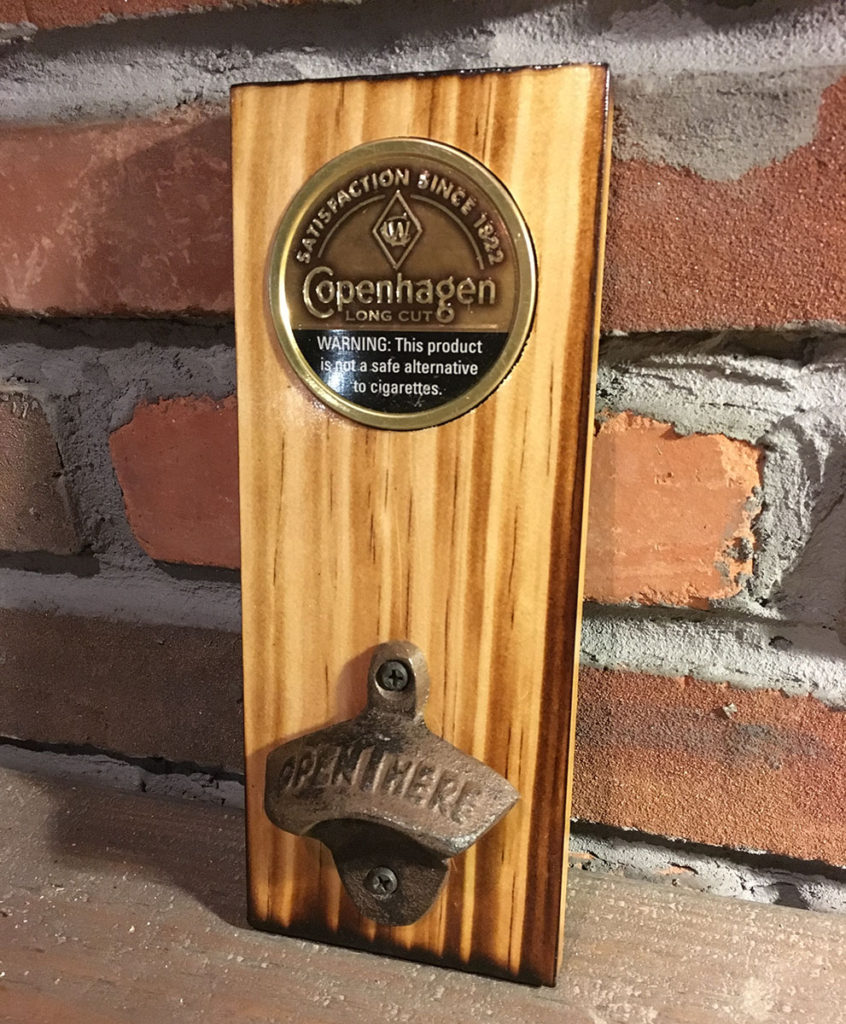 This wall mounted bottle opener is a great addition to a man cave, bar, garage, restaurant and more! Made with found wood and Copenhagen Tobacco tins, your friends will be asking for another cold one just to take a second look at this fun bottle opener!