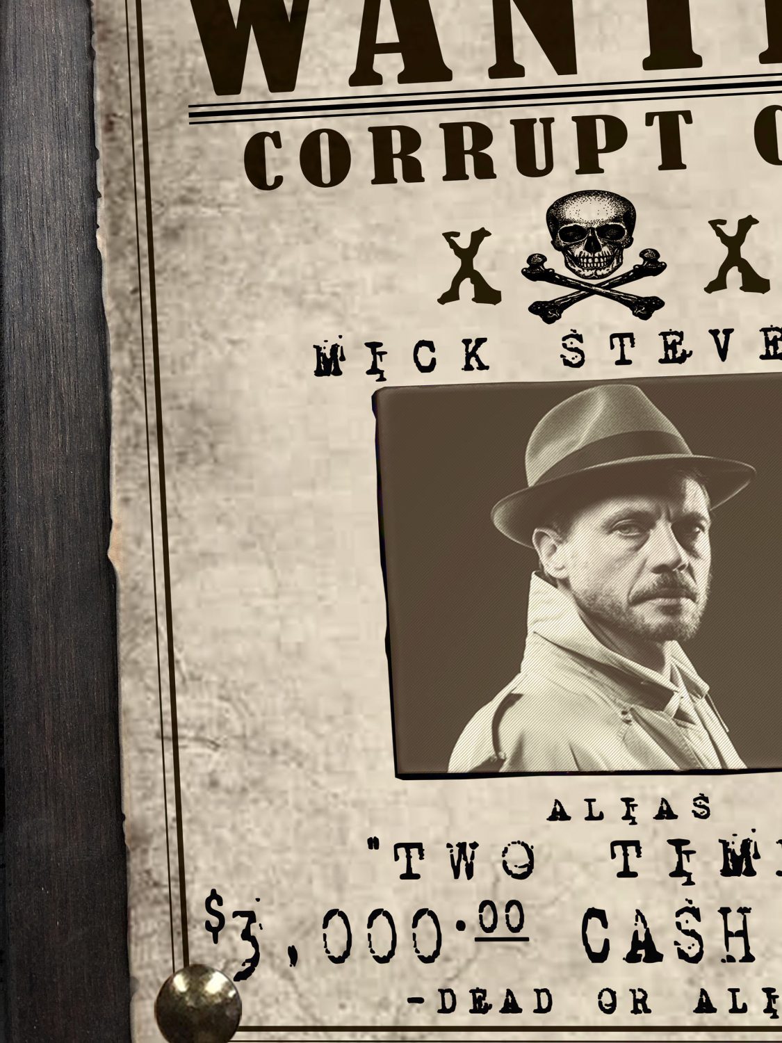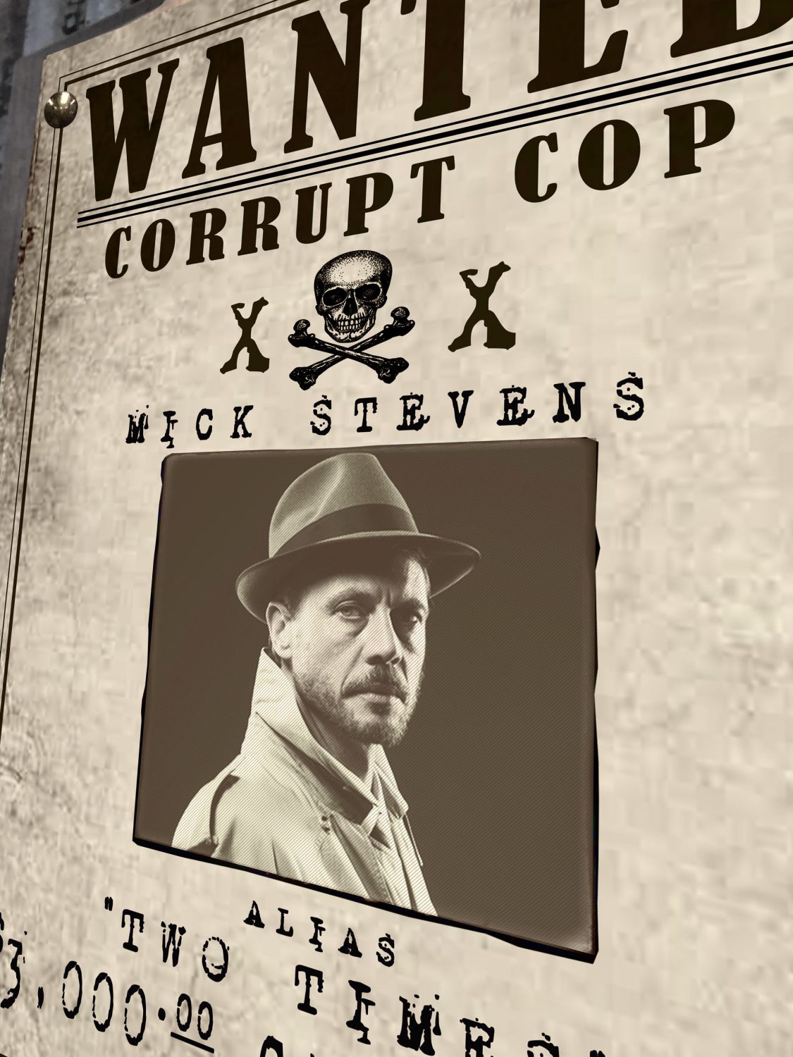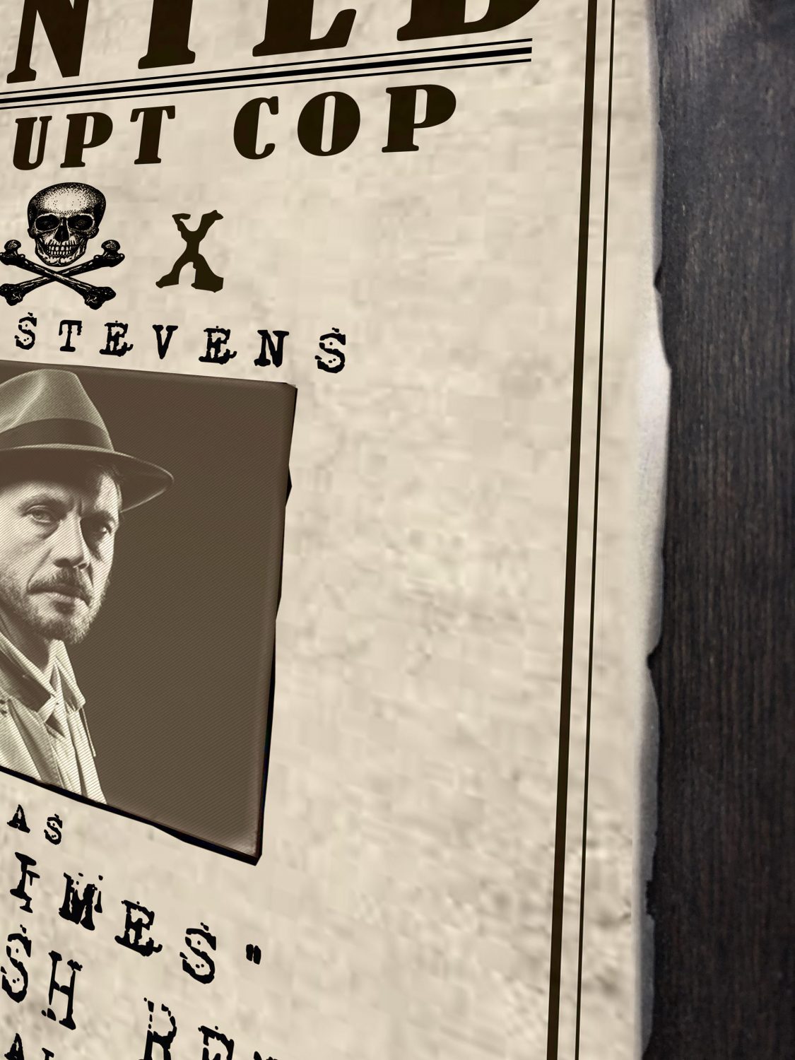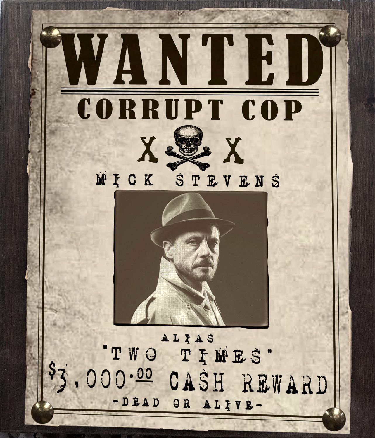 Beware of the dirty corrupt police officer! This cop has a bad attitude and cannot be trusted. There is a large reward for bringing this dirty law enforcement officer to justice. This dirty cop wanted old fashion style newspaper print on wood and corrugated steel is the perfect for any old timey themed area.