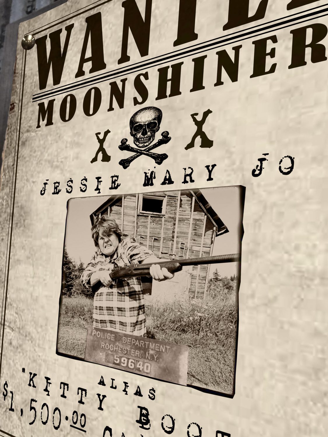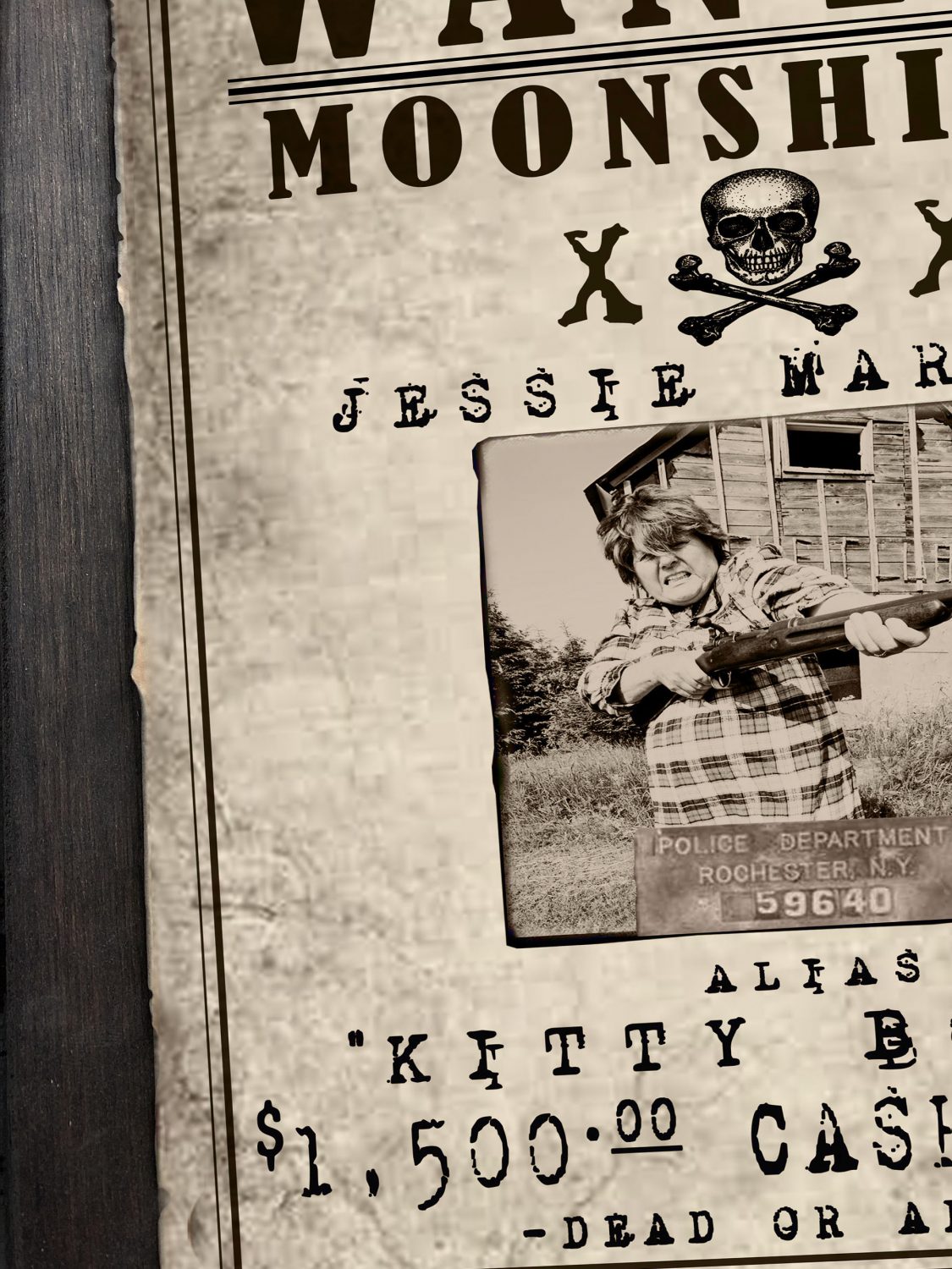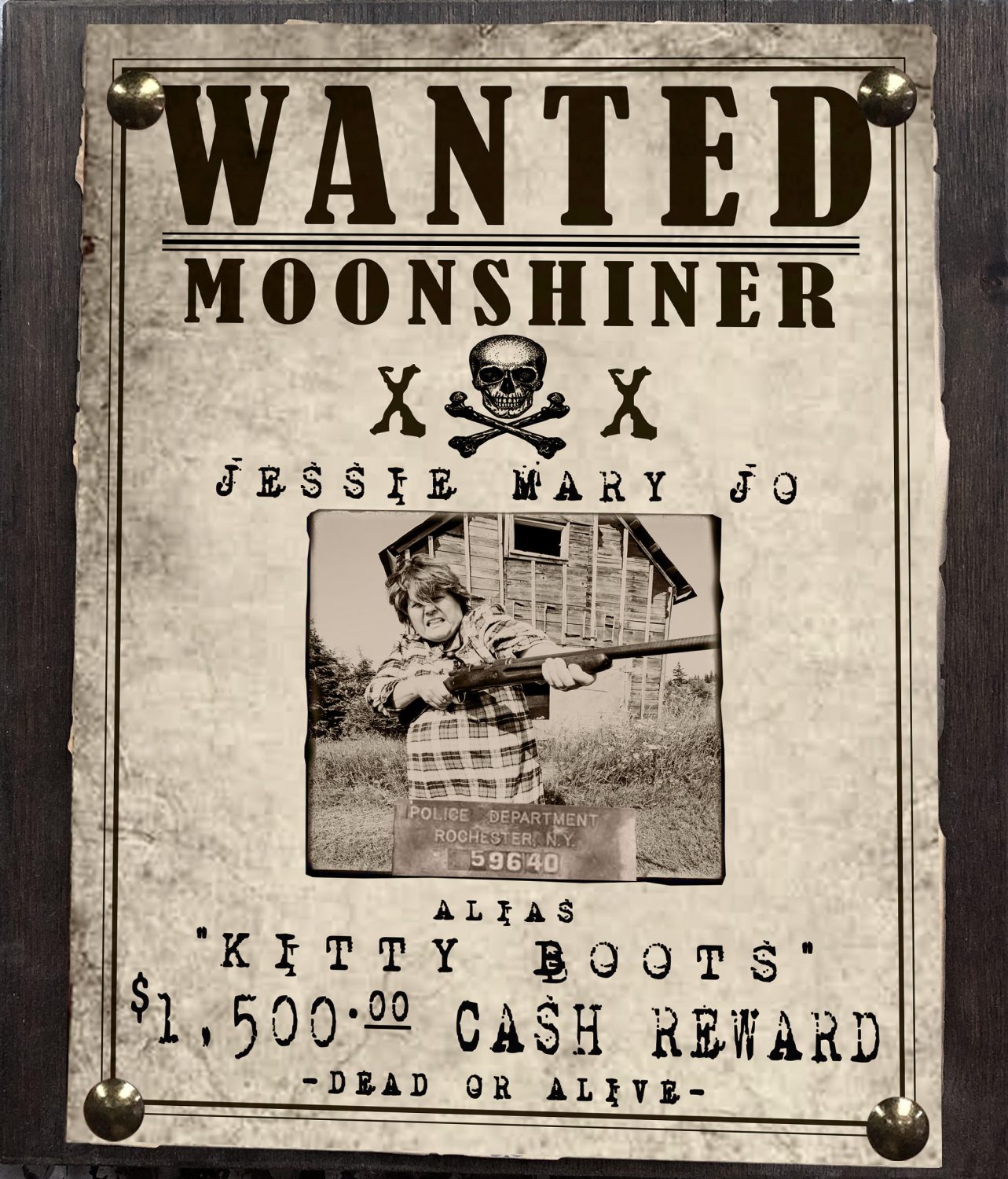 Here is another fun moonshiner wanted poster for your rustic space! The ladies were also known to run a bit of shine back in the day! This moonshiner wanted old fashion style newspaper print on wood and corrugated steel is the perfect for any old timey themed area.