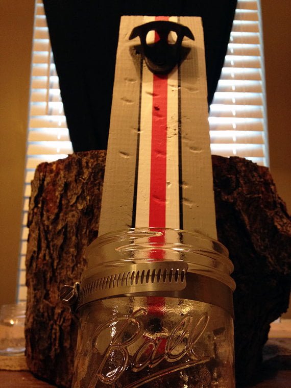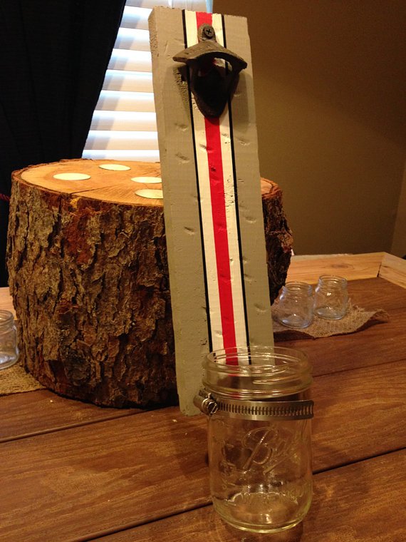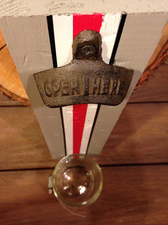 The scarlet and gray bottle opener is a great addition to any sports fans man cave, garage, patio or anywhere you want to show love for your favorite team! Made with rustic wood and a real cast iron bottle opener. Featuring the colors from the pride of the Buckeye state.