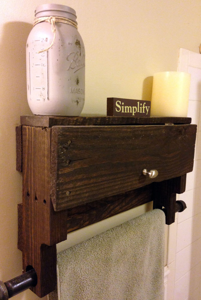 A Pallet Towel Rack is the perfect way to decorate your rustic bathroom. This rustic pallet towel rack also makes for great storage with a hinged storage compartment! This towel rack goes great in your your bathroom, kitchen, basement, man cave, garage or any space you want to decorate with a woodland, rustic feel. The top shelf is the perfect place to display pictures of friends and family, display candles or other home decor while the gas pipe towel holder is strong and durable to hold your bathroom towels.