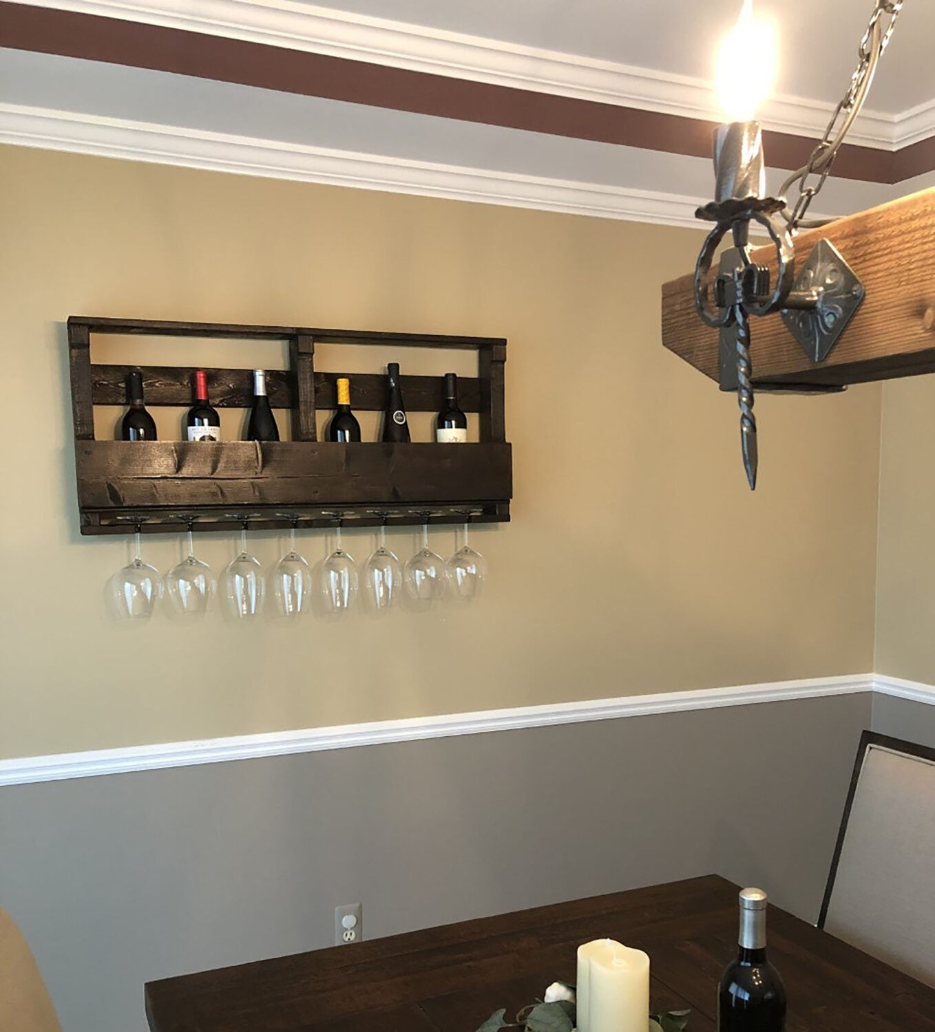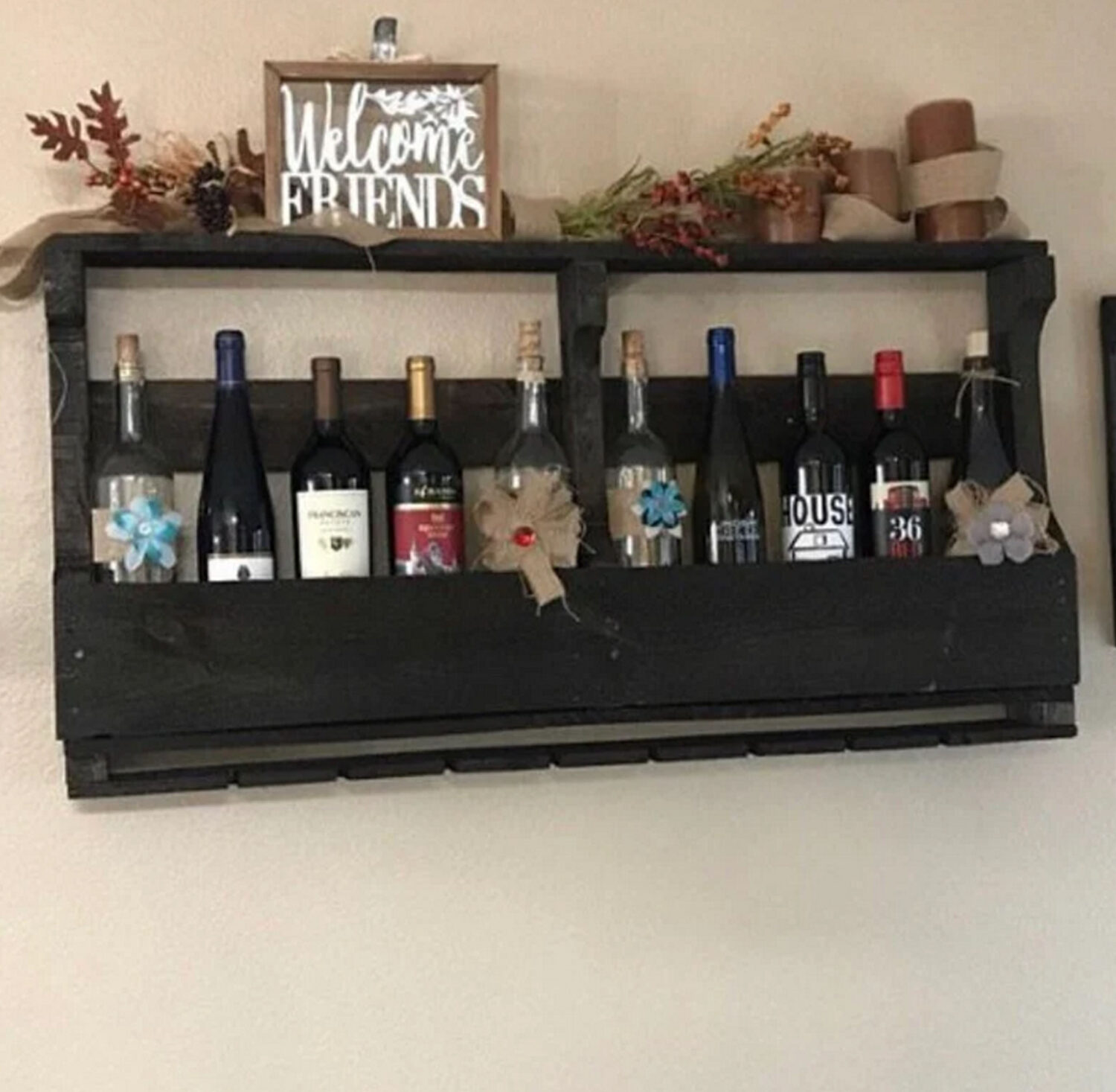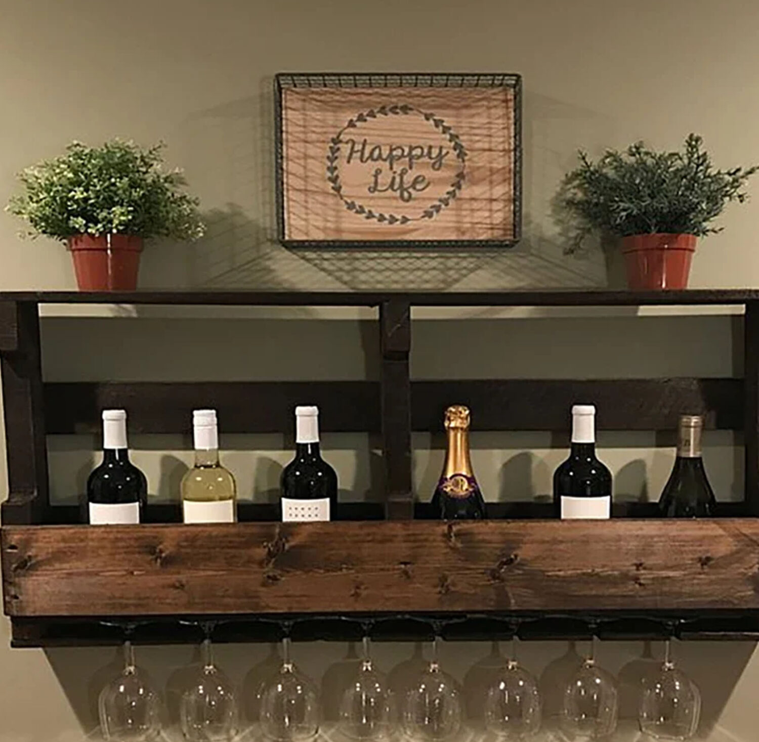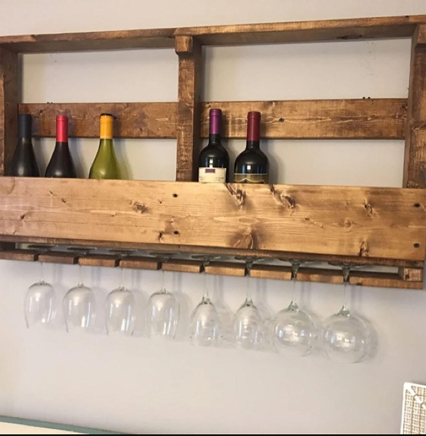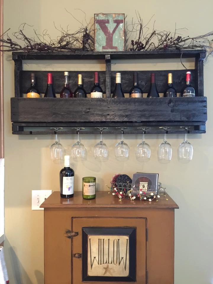 Our rustic farmhouse style wine rack with top shelf makes a great piece for your home! Get the Pistol Pete’s Pallet Wine Rack for your bar, kitchen, basement, garage or any space you want to decorate with a woodland, rustic or farmhouse feel. Wine Rack holds 8 glasses of many sizes and shapes and around 8 bottles. The top shelf makes a great place to display pictures of friends and family, store bar accessories and more.